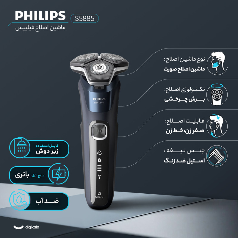 خط زن - ضد اب - ساخت هلند - سری 360 درجه - Skin IQ - اصلاح 90000 مو در دقیقه - دارای 45 تیغه - 3 نمایشگر میزان شارژ -
