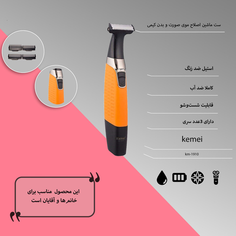 دارای دو عدد تیغە بسیار تیز و دقیق از جنس استیل ضد زنگشارژی با ورودی USBکاملا ضد آبکوچک، قابل حمل و کاربردیمناسب برای خانمها و آقایانمناسب ریش ، ابرو و بدن