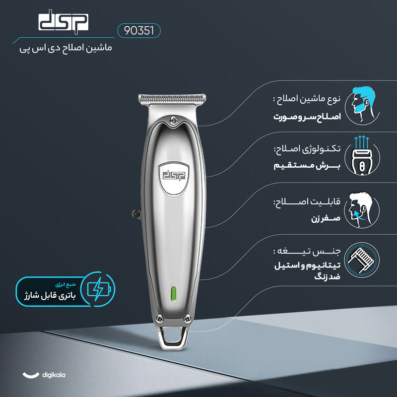موتور قدرتمند با سرعت 7000 دور در دقیقه، تیغههای استیل ضد زنگ با روکش تیتانیوم، تیغههای خود تیز شونده T شکل، نشانگر LED برای نمایش میزان شارژ