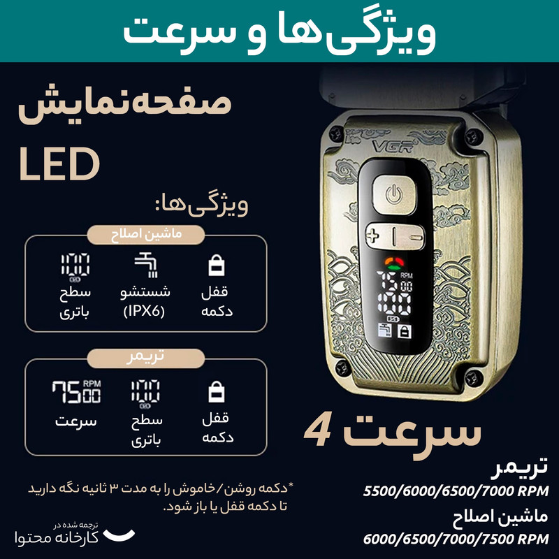 قابلیتها: نمایش وضعیت باتری , طراحی ارگونومیک , قابلیت اصلاح با شماره صفر , قابلیت تنظیم سرعت