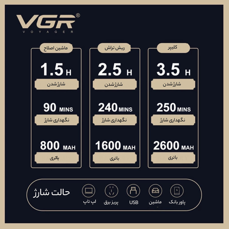 سایر مشخصات : شیور: مدت زمان شارژ 1/5 ساعت، زمان عملیات 90 دقیقه، باتری 800 میلی آمپر/ خط زن: زمان شارژ 2/5 ساعت، زمان عملیات 240 دقیقه، باتری 1600 میلی آمپر/ حجم زن: زمان شارژ 3/5 ساعت، زمان عملیات 250 دقیقه ، باتری 2600 میلی آمپر