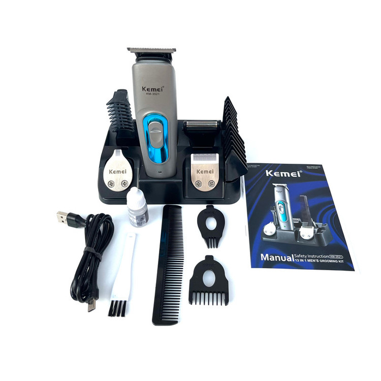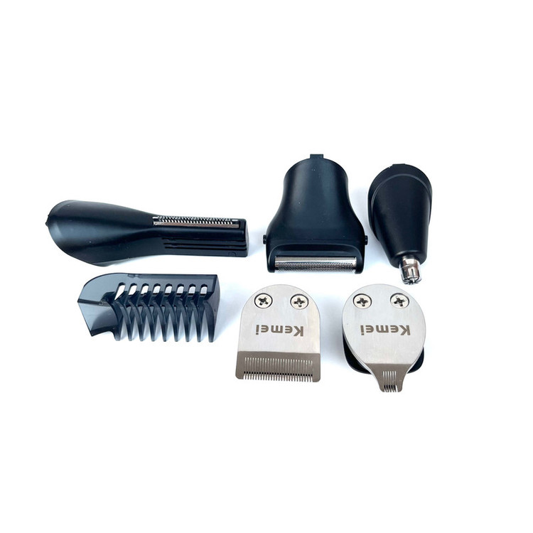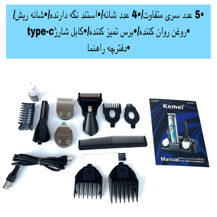 دارای 5 عدد سری متفاوت جهت اصلاح موی صورت/بدن/بینی و گوش-دارای 4 عدد شانه-استند نگه دارنده-چراغ نشانگر شارژ-