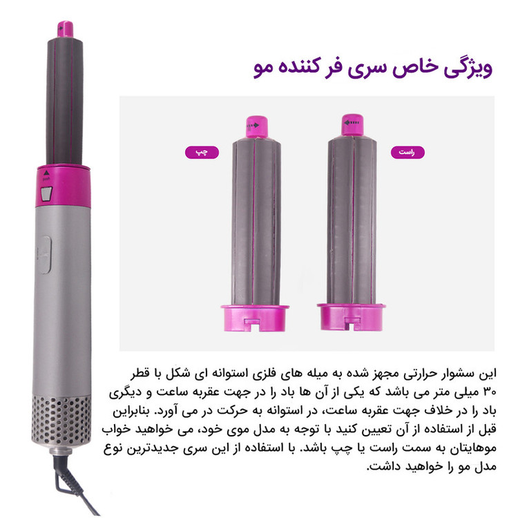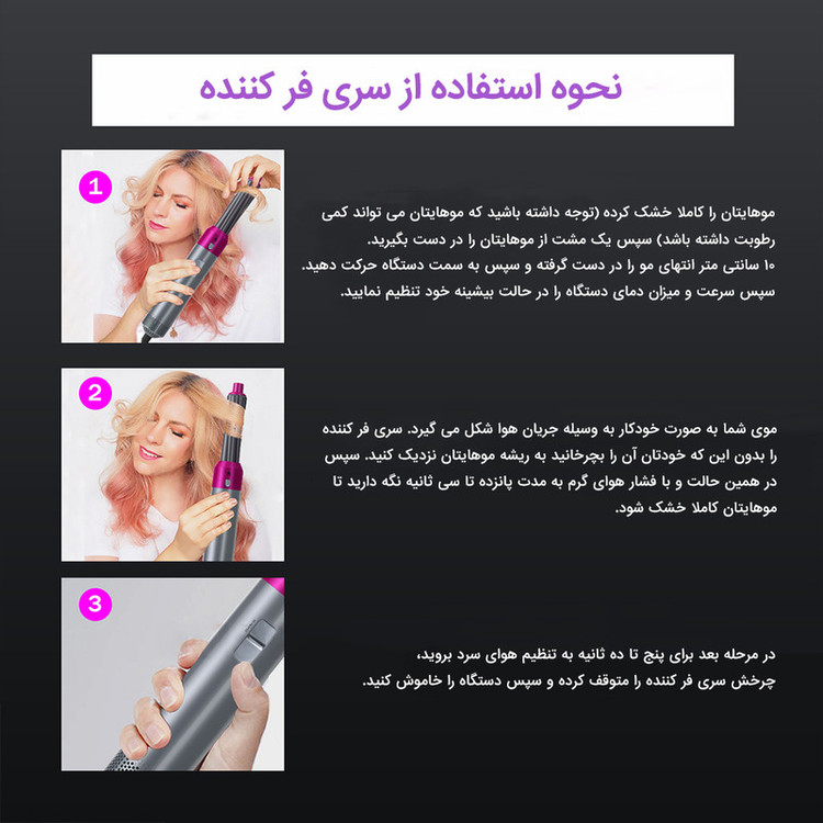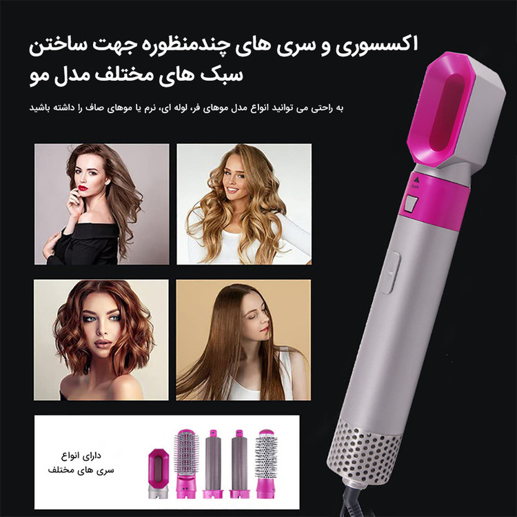 اقلام همراه سشوار: متمرکزکننده پهن , سری برسدار گرد باریک , سری برسدار گرد پهن , سری برسدار تخت