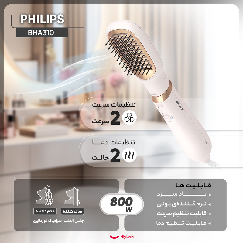 سشوار برسدار تخت برای صافی و خشک کردن - 800 وات - صفحات سرامیک با روکش ارگان برای حداقل اسیب ب مو - ایونیک برای فریز کردن و ضد وزی و اسیب کمتر ب مو - تنظیم حرارت 3 حالته - برس گرد سیمی 38 میل - برس گرد 30 میل - متمرکز کننده - سیمگردان