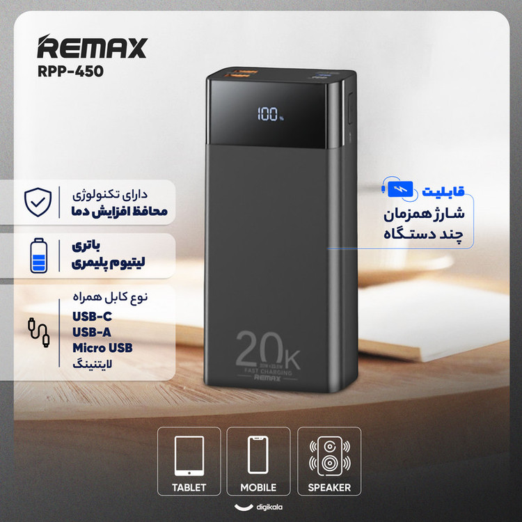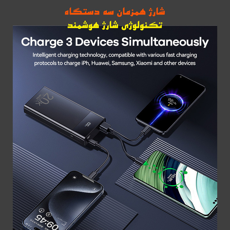 دو پورت خروجی USB-A دو پورت ورودی Type-C و Lightning یک پورت خروجی Type-C ماکزیمم توان خروجی 22.5 وات صفحه نمایش ال سی دی تکنولوژی فست شارژ