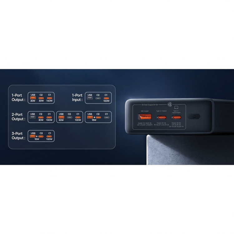 مشخصات فنی: ولتاژ ورودی : Type-C1 Input: 5V/3A; 9V/3A; 12V/3A; 15V/3A; 20V/3.25A | توان خروجی : Type-C1 Output: 5V/3A; 9V/3A; 12V/3A; 15V/3A; 20V/5A;28V/5A | Type-C Output: 5V/3A; 9V/3A; 12V/2.5A; 15V/2A | USB Output: 5V/3A; 9V/3A; 12V/2.5A; 10V/2.25A(SCP)