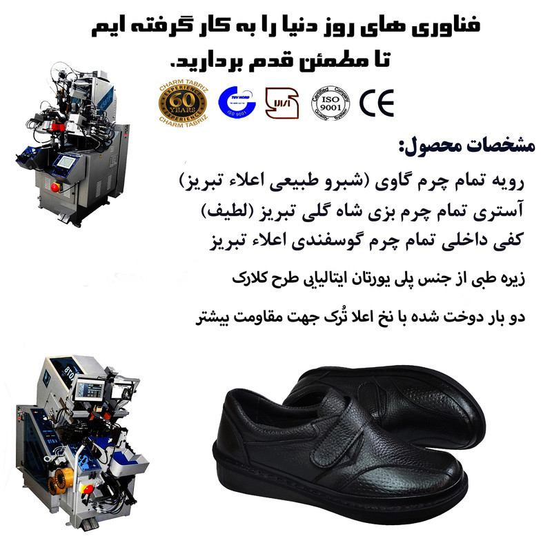 تهیه شده از مرغوب ترین چرم طبیعی (تمام چرم) رویه، آستر و کفی چرم طبیعی زیره طبی از جنس پلی یورتان با مواد اولیه ایتالیایی
