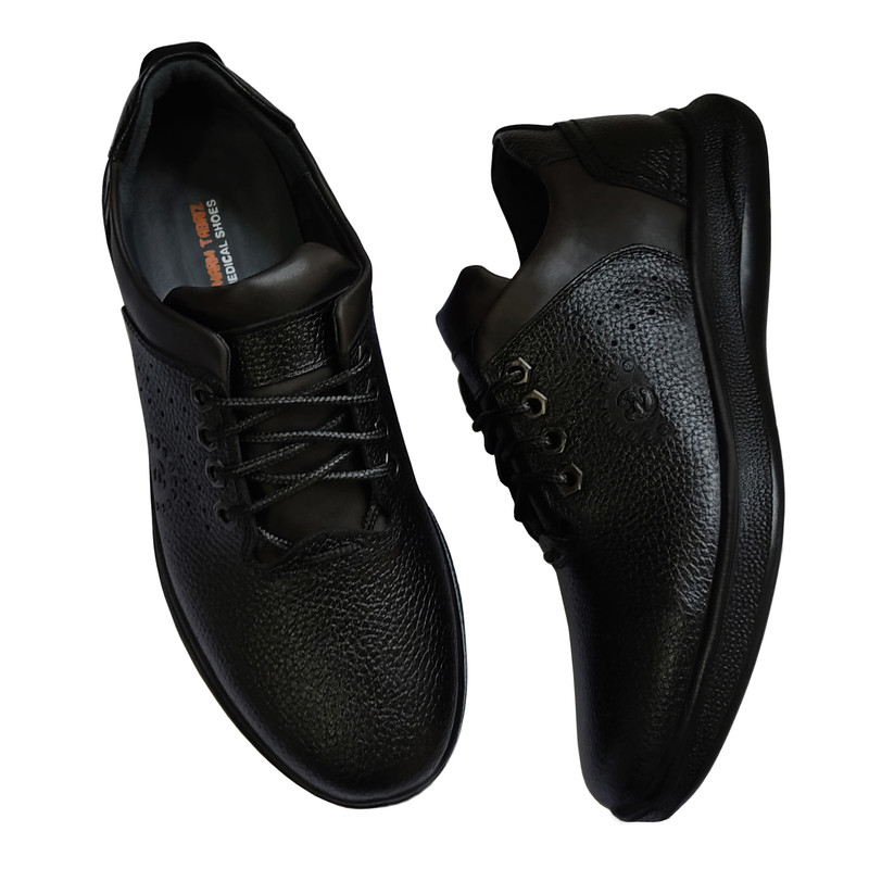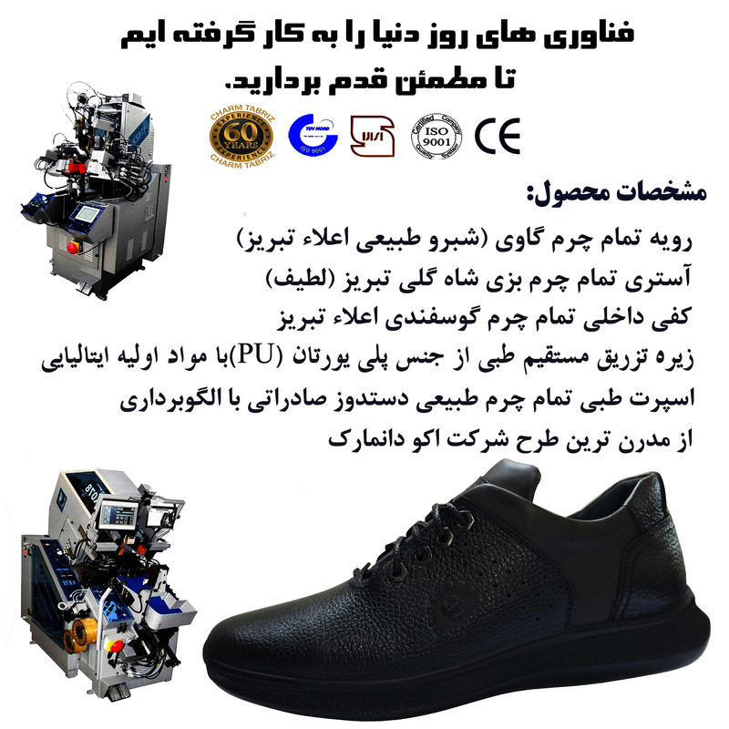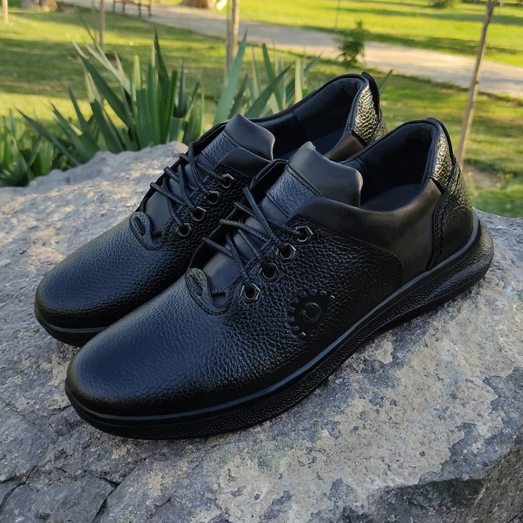 تهیه شده از مرغوب ترین چرم طبیعی (تمام چرم) رویه، آستر و کفی چرم طبیعی زیره طبی از جنس پلی یورتان با مواد اولیه ایتالیایی(تزریق مستقیم)