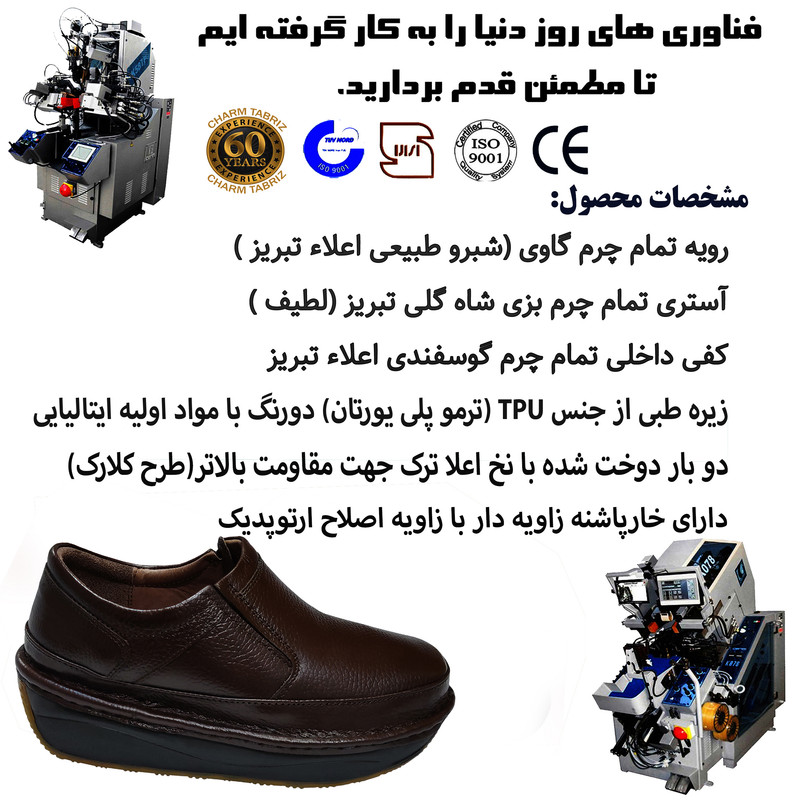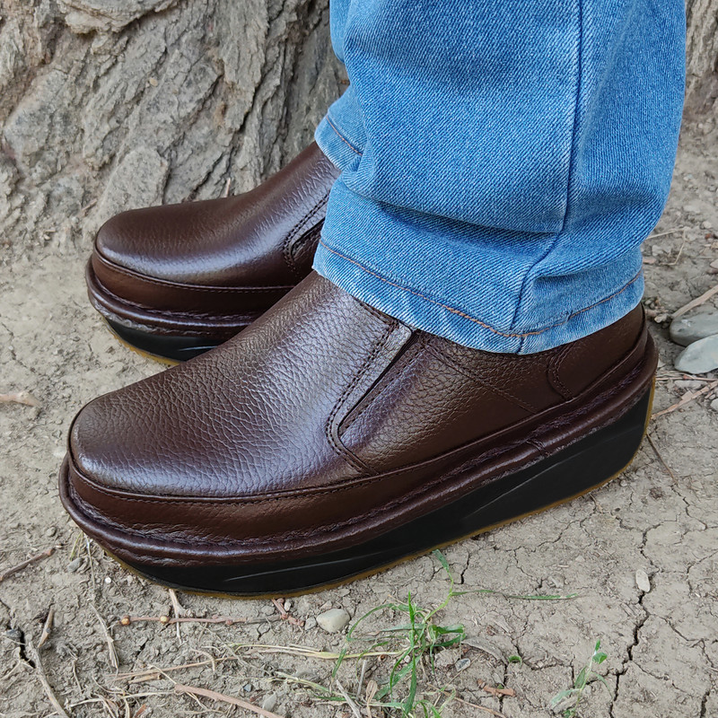 قالب استاندارد طرح Clarks و کاملا طبی با خار پاشنه زاویه دار جهت کاهش فشارهای وارده و رفع خستگی دارای کفی بسیار ضخیم و نرم جهت درمان خارپاشنه و دردهای ستون فقرات