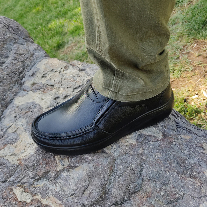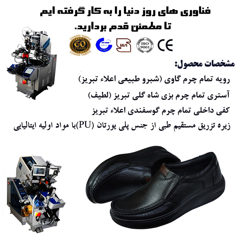 تهیه شده از مرغوب ترین چرم طبیعی (تمام چرم) رویه، آستر و کفی چرم طبیعی ، زیره طبی تزریق مستقیم از جنس پلی یورتان با مواد اولیه ایتالیایی ، قالب استاندارد