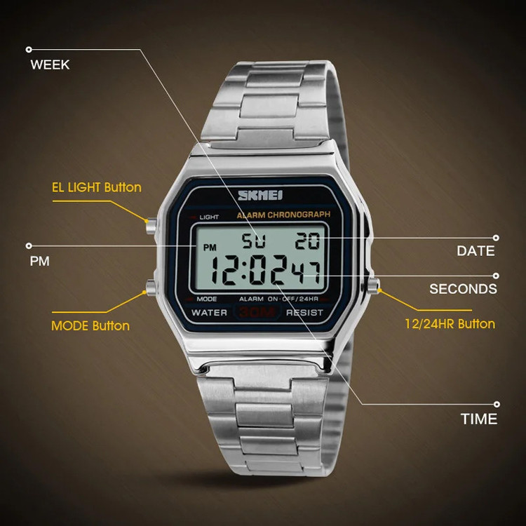 نمایش 24 ساعته , نور پسزمینه , تاریخشمار , آلارم , ضدآب , تایمر