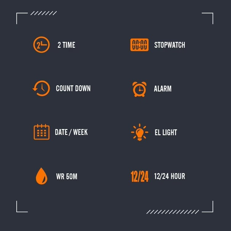 تایمر , صفحه طرحدار , نمایش 24 ساعته , نمایش ساعت دوم , نور پسزمینه , تاریخشمار , آلارم , کرنوگراف , ضدآب