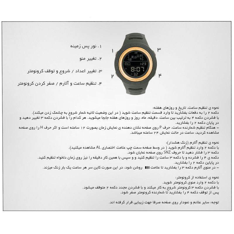 - ساعت مچی دیجیتال - دارای بند تک رنگ ساده - دارای شیار روی بند - صفحه ساخته شده از استیل ضد زنگ - قطر صفحه داخلی ساعت 31 میلی متر - ضد آب با قابلیت استفاده هنگام شنا در استخر - قابلیت نمایش روزهای هفته - دارای نور پس زمینه