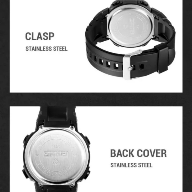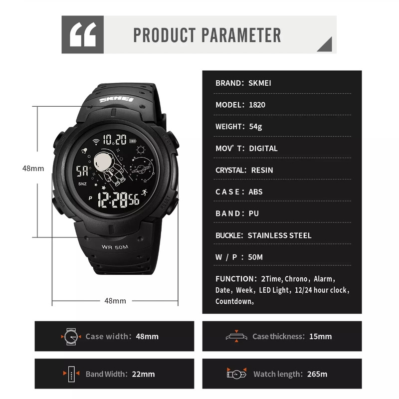 2 زمانه قفل استیل بند PU ضد آب 50M کورنومتر آلارم تقویم نمایش روزهای هفته نور پشت صفحه قطر صفحه 48 میلیمتر Dial Width: 48mm, Dial Thickness: 15mm, Band Width: 22mm, Watch Length: 265mm