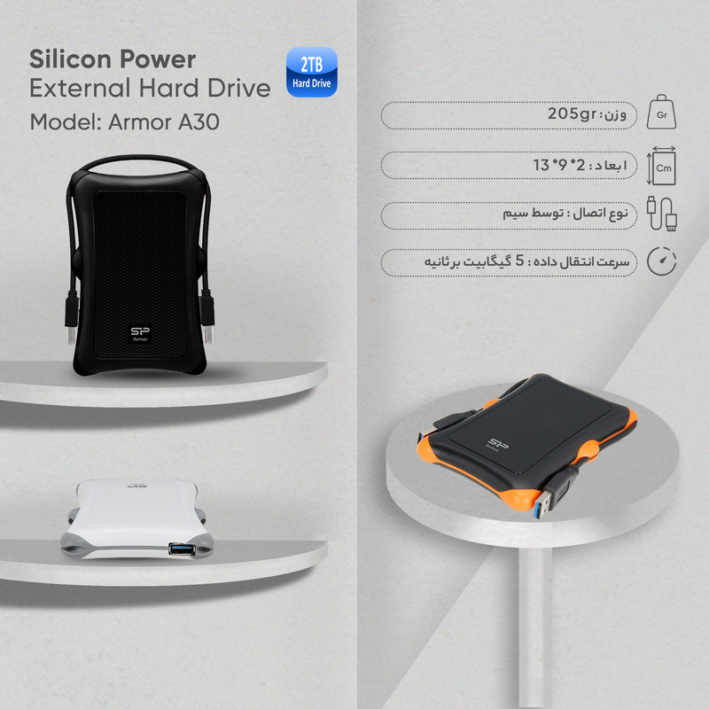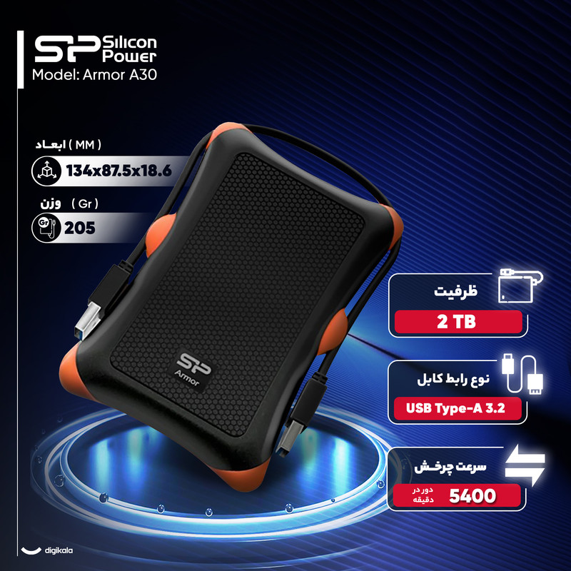هارد اکسترنال Silicon Power Armor A30 با ظرفیت دو ترابایت، ترکیبی از دوام فیزیکی و عملکرد پایدار را در یک طراحی قابل حمل ارائه میدهد. این محصول با وزن دویست و پنج گرم و ابعاد صد و سی و چهار در هشتاد و هفت و نیم در هجده و شش میلیمتر، بهراحتی در کیف لپتاپ یا کولهپشتی جای میگیرد و برای جابهجاییهای مکرر مناسب است. استفاده از فرم فکتور دو و نیم اینچی و سرعت چرخش پنج هزار و چهارصد دور در دقیقه، آن را به گزینهای متوازن برای ذخیرهسازی دادههای حجیم و استفاده روزمره تبدیل کرده است.