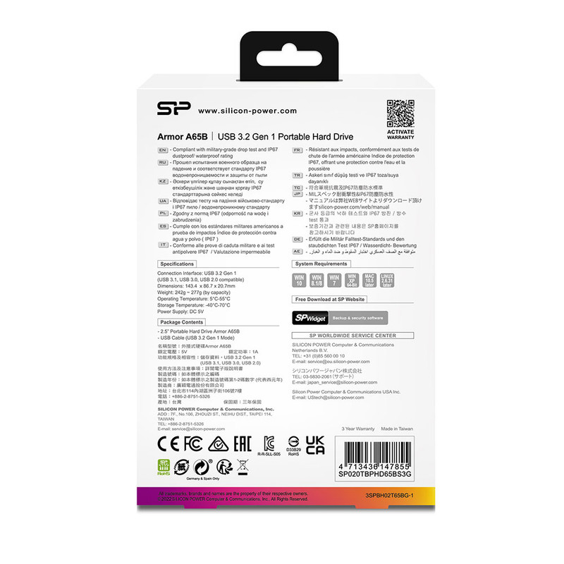 جدیدترین هارد دیسک ضد ضربه و ضد آب این شرکت از سری Armor با نام A65 عرضه شده که دارای گواهینامه IP67 است و از طراحی ویژه ای برخوردار است.هارد جدید سیلیکون پاور از سری Armor، از نوع هارد اکسترنال پرتالاست. بنابراین می توانید بدون نیاز به آداپتور آن را به کامپیوتر وصل کنید.هارد بدنه ای پلاستیکی دارد و روی آن با پوششی مات از جنس لاستیک سیلیکونی پوشیده شده است که این پوشش علاوه بر این که خاصیت ضربه گیری دارد، از سر خوردن هارد روی سطوح مختلف نیز جلوگیری می کند.چراغ نشانگر فعالیت هارد نیز در جلوی آن قرار گرفته است و در پشت هارد، بخشی از پوشش سیلیکونی برش خورده تا بتوانید موقع جابه جا کردن هارد، سیم را در آنجا قرار دهید.در بنچ مارک هایی که با استفاده از درگاه USB 3.0 گرفتیم، سرعتWrite حدود 100مگابایت بر ثانیه و سرعت Read حدود 120 مگابایت برثانیه برآورد شد که رضایت بخش است.هارد دیسک A65، به عنوان «اولین هارد ضد ضربه و ضد آب دنیا با قابلیت پسورد گذاری در دنیا» معرفی شده که البته شما می توانید با نرمافزارهای مختلفی، خودتان هم این کار را انجام دهید. این هارد به استاندارد نظامی MIL-STD 810G مجهز است که یعنی سلامتی آن در صورت سقوط از ارتفاع 122 سانتی متری آن هم با 26 سطح تماس با محل برخورد، تضمین شده است. این مدل همچنین گواهینامه IP67 برای مقاوت در برابر نفوذ آب و گرد و خاک را دارد.داشتن این گواهینامه یعنی هارد یاد شده می تواند تا 30 دقیقه در عمق100 سانتی متری آب دوام بیاورد.از دیگر امکانات مقاومتی این هارد دیسک می توان تجهیزات سخت افزاری ضد شوک آن را نام برد که در داخل هارد قرار گرفته اند و دلیل اصلی ابعاد بزرگ آن نیز همین است. A65 در برابر شوک الکتریکی نیز مقاوم است.
