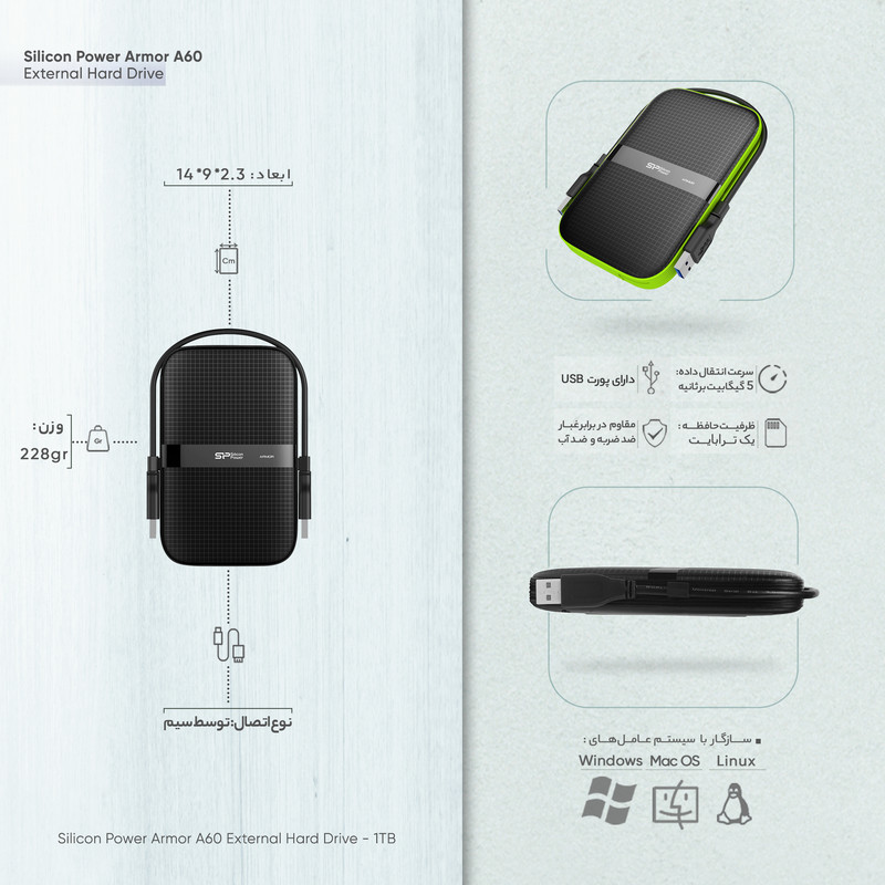 هارددیسک «A60» یکی از جدیدترین محصولات سری آرمور (Armor) ساخت شرکت سیلیکون پاور (Silicon Power) است. کمپانی سیلیکون پاور یکی از بزرگترین طراحان و سازندگان فلش مموری و هارددیسک اکسترنال در دنیا است و این سری از هارددیسکهای اکسترنال خود را با نام آرمور (Armor) به معنای زره یا ضدگلوله طراحی و تولید کرده است. البته این نامگذاری آنقدرها هم اغراقآمیز و بیدلیل نبودهاست؛ این سری از هارددیسکها در برابر آب، ضربه، گرد و غبار، فشار و لرزش مقاوم هستند. ناگفته نماند این خاصیتها در آزمایشهای مختلف کمپانی سیلیکون پاور به اثبات رسیدهاند. هارددیسک اکسترنال آرمور A60، دارای استاندارد تست سقوط آزاد ارتش آمریکا (با کد استاندارد MIL-STD) است و در مقابل سقوط تا ارتفاع 122 سانتیمتری مقاوم است. A60 دارای استاندارد IPX4 نیز هست که به معنی مقاوم بودن آن در برابر آب است. البته این هارددیسک شیک و جذاب در مقابل شوک، لغزش، خط و خش و گرد و غبار هم مقاوم است. در حال حاضر در ظرفیتهای 500 گیگابایت، 1 ترابایت و 2 ترابایت به بازار عرضه شده و در دسترس شما قرار گرفتهاست. این هارد دیسک از رابط پرسرعت USB 3.0 بهره میبرد و در عین حال، با رابط قدیمیتر USB 2.0 هم سازگاری کامل دارد. هارد دیسک A60 انرژی مورد نیاز خود را از همین رابط USB تأمین میکند و این کار را بهصورت همزمان در حال تبادل اطلاعات انجام میدهد. این هارد دیسک برای افرادی که بیشتر زمان خود را در حال حرکت هستند یا افرادی که میخواهند اطلاعات مهم خود را همیشه همراه داشته باشند و نمیخواهند نگران از بین رفتن اطلاعات بر اثر آسیب و خطرات ناگهانی باشند، بسیار مناسب است.