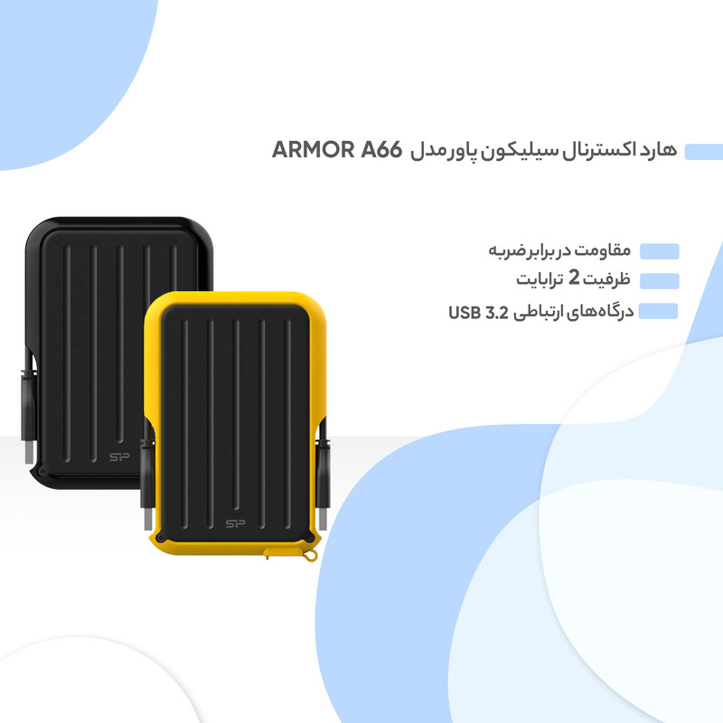 هارد اکسترنال «Armor A66» محصولی از شرکت «سیلیکون پاور» است که از ظرفیت یک تاپنج ترابایت برای ذخیرهسازی اطلاعات بهره میبرد. شرکت سیلیکون پاور هارد اکسترنال A66 را روانه بازار کرده است. هارد اکسترنال حاضر مدل Armor A66 بوده که ابعاد بسیار باریکتری دارد. این محصول شرکت سیلیکون پاور از بدنهای پلاستیکی و مقاوم در برابر انواع صدمات بهره میبرد. این بدنه به صورتی طراحی شده میتواند در برابر خط و خش مقاوم باشد. هارد اکسترنال Armor A66 از طریق رابط USB3.2 به کامپیوتر متصل میشود و میتواند اطلاعات را با سرعت زیاد انتقال دهد. این هارد در برابر پاشش آب، خط و خش و شوک مقاوم است. مقاومت هارد در برابر این صدمات باعث شده که خیال کاربر از به وجود آمدن مشکلات شایع در هاردهای اکسترنال آسوده باشد. کابل این محصول به بدنهی آن متصل است این هارد در رنگ های مشکی نوار مشکی - مشکی نوار زرد - مشکی نوار ابی تولید شده است
