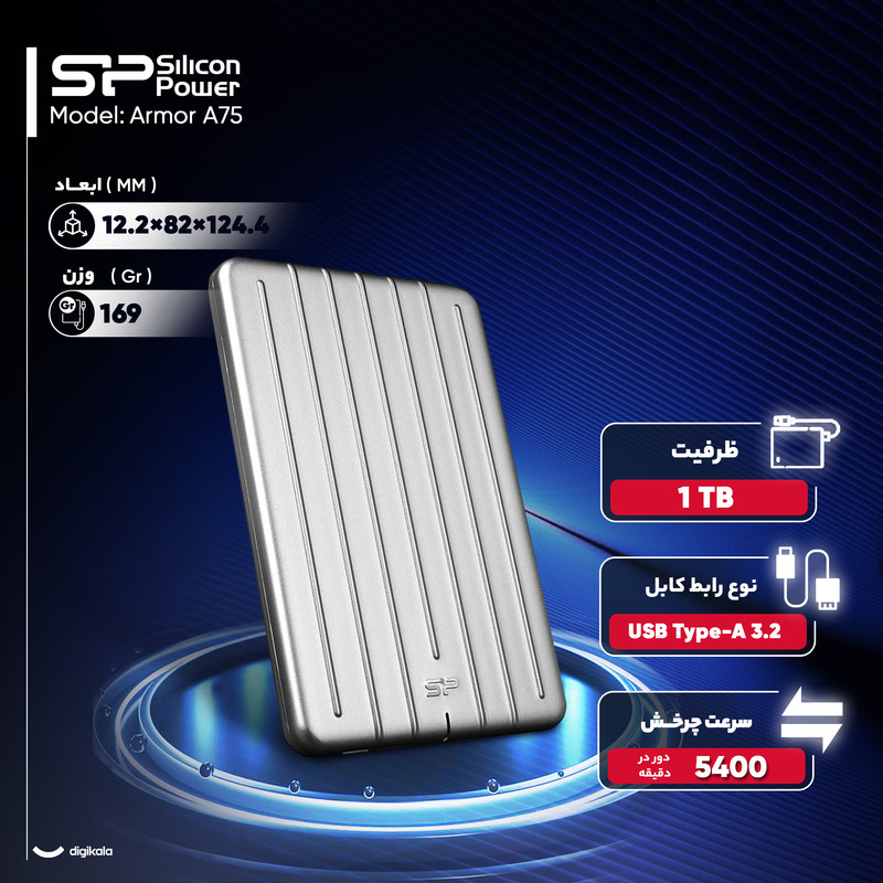 هارد اکسترنال سیلیکون پاور مدل Armor A75 با ظرفیت یک ترابایت، دستگاهی جمعوجور و مقاوم است که برای ذخیره و جابجایی دادهها در شرایط مختلف طراحی شده است. این هارد با فرمفکتور ۲.۵ اینچ و وزن ۱۶۹ گرم، یکی از گزینههای سبکوزن در میان هاردهای خارجی محسوب میشود که حمل آن آسان است و به راحتی در کیف لپتاپ یا کولهپشتی جای میگیرد. ابعاد این مدل نیز ۱۲۴.۴×۸۲×۱۲.۲ میلیمتر است که تعادل خوبی میان حجم مناسب ذخیرهسازی و اندازه فیزیکی کوچک برقرار کرده است.