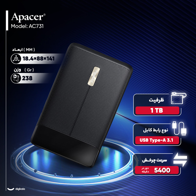 هارد اکسترنال اپیسر مدل AC731 با ظرفیت یک ترابایت، محصولی قابل حمل و مقاوم است که برای کاربرانی طراحی شده که علاوه بر نیاز به ذخیرهسازی داده، به دوام و امنیت فیزیکی دستگاه نیز اهمیت میدهند. این مدل از دیسک مکانیکی ۲.۵ اینچی با سرعت چرخش ۵۴۰۰ دور در دقیقه بهره میبرد که تعادلی مناسب میان ظرفیت، قابل حمل بودن و مصرف انرژی ایجاد میکند.