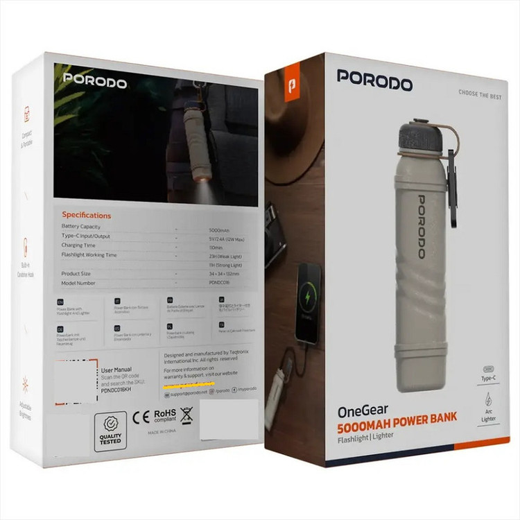 ظرفیت باتری: ۵۰۰۰ میلیآمپرساعت ورودی/خروجی Type-C: ۵ ولت / ۲.۴ آمپر (حداکثر ۱۲ وات) زمان شارژ: ۱۱۰ دقیقه مدت زمان کارکرد چراغقوه: ۲۳ ساعت (نور ضعیف) / ۱۱ ساعت (نور قوی)