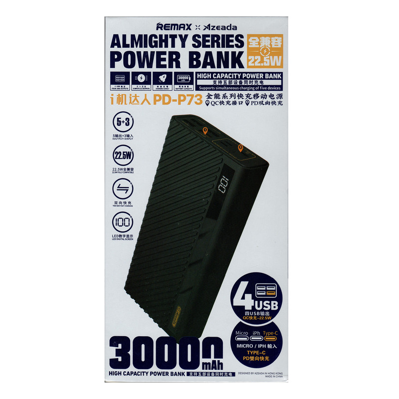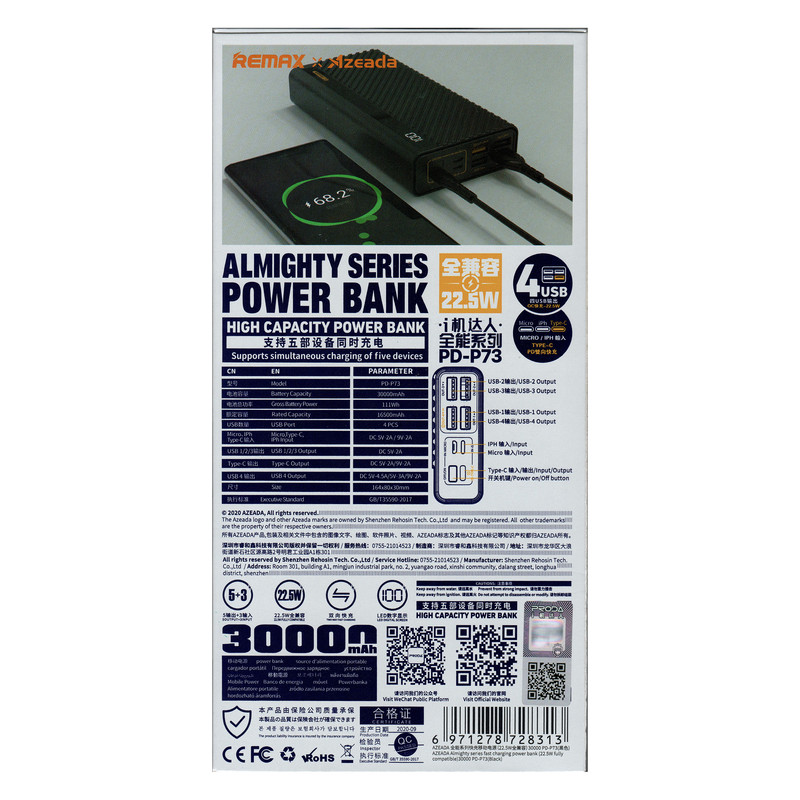 مشخصات فنی: سه عدد خروجی USB A توان 2 آمپر / یک عدد خروجی USB A توان خروجی 4.5 آمپر/ 3 پورت ورودی، یکی نوع Type-C / یکی نوع Micro-USB /یکی نوع Lightening