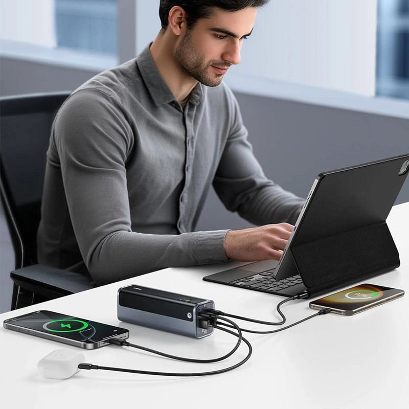 پاوربانک Baseus EnerGeek GP12 با ظرفیت اسمی 20800 mAh و توان خروجی کلی تا 145 W، باتری لیتیوم‑پلیمری، پشتیبانی از شارژ سریع PD، PPS و QC، نمایشگر دیجیتال میزان شارژ، امکان شارژ همزمان چند دستگاه و محافظتهای ایمنی استاندارد