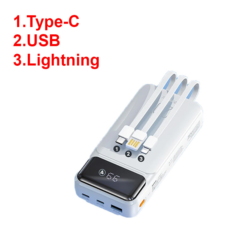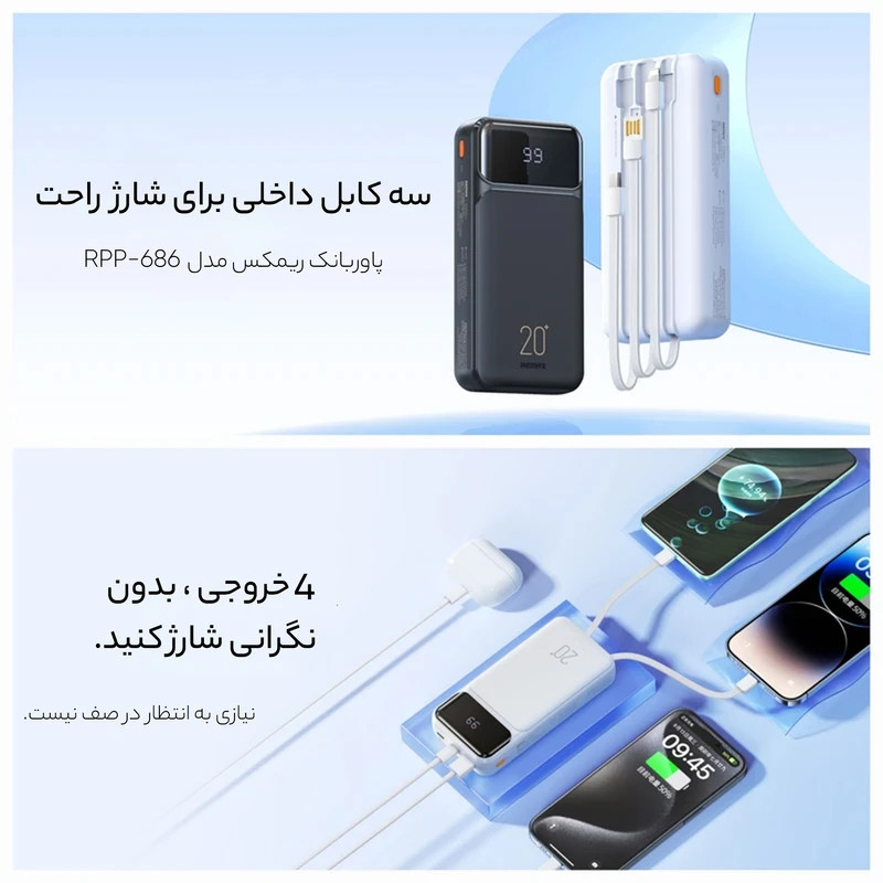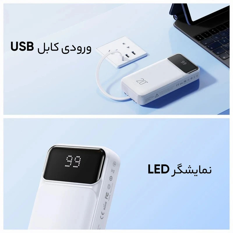 مشخصات فنی: ظرفیت ۲۰۰۰۰ میلی آمپر ساعت / دارای ۱ عدد کابل متصل به پاوربانک (کابل سرخود) تایپ c / دارای ۱ عدد کابل متصل به پاوربانک (کابل سرخود) لایتنینگ اپل / دارای ۱ عدد پورت تایپ سی(خروجی و ورودی) / دارای ۱ عدد پورت USB